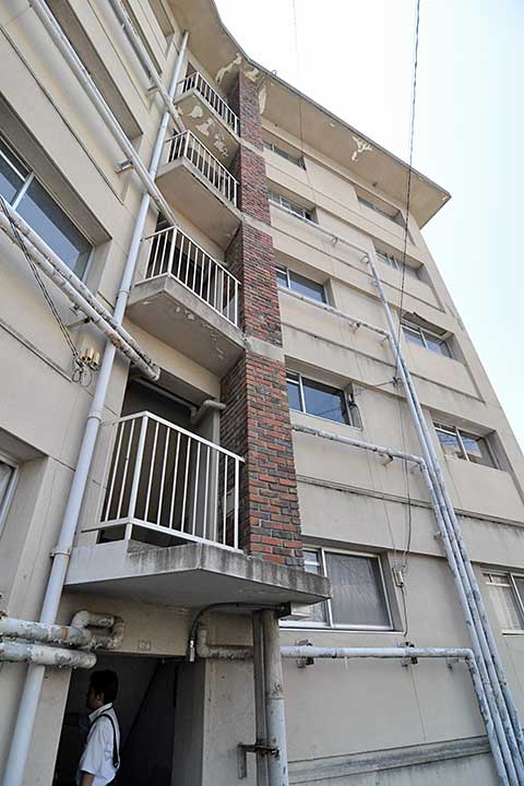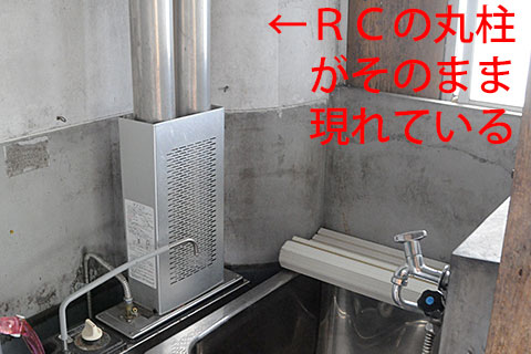 おそらく当初のオリジナルのままと思われる住戸内を見学した(下記平面プランにおけるAタイプと左右対称の設計)。水平連続窓であることがとてもよく分かる(写真#5-6)。キッチンシンクはステンレスでおなじみのサンウェーブ製(写真#7)で、その横には人研ぎの大型シンク(洗濯用と推測)。浴室はおそらく住人が浴槽を持ち込む方式で、煙突がややこしいことになっているが、気になったのはRCの丸柱のかたちがそのまま現れている点(写真#8)。どうやら断熱材も何もなくRC躯体むきだしのようだ。これは居室も同じで、壁もRC躯体そのままという割り切った仕様であった。
