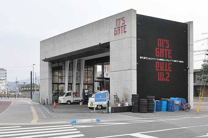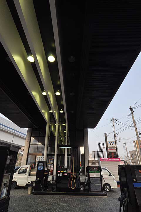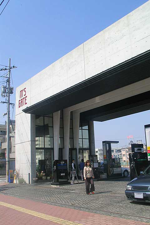 幹線道路に沿って立つガソリンスタンド。都市計画道路を通す関係で大きく削られ細長くなった敷地条件に対して建築家が出した答えは、ガソリンスタンドらしくないシンプルな「門」だった。外観は打ちっ放しで派手さは無いが、人の目を引くことは間違いなく、将来のコンバージョンを考える際にも有利であろう。