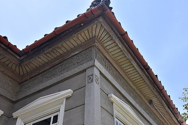 構造は木造だが外観は左官仕事で石造りのように見せ、様式建築らしく雷紋も付いている。縦長窓に付く窓枠は上げ下げ式で、よく見ると窓枠の上部にはペディメントが付く。軒裏を板張りにするのも洋館の作法で、本作でも丁寧につくられている。一方で側面は(隣地に家が建っていたためか)擬石とはなっていない。