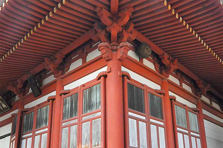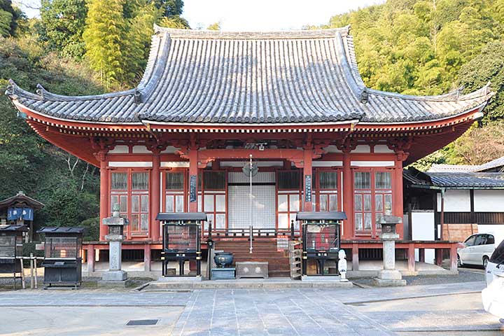 本堂は鎌倉時代末期の建立で、平面形は正方形(桁行5間-梁間5間)で向拝1間(江戸時代のもの)が付く。入母屋造の本瓦葺き。和様をベースに大仏様・禅宗様を組み合わせた折衷様で、大陸との交易の影響なのか中国風デザインの影響が強く出ている。垂木は平行垂木であるが屋根は強く反り上がり、戸は桟唐戸。前面(外陣側)は桟唐戸がズラリと並ぶが、後ろ側(内陣側)は板壁となっている(写真#2)。禅宗様らしい特徴として、柱間をつなぐ部材として長押代わりに貫が使われ、柱の先端部は粽になっていて台輪(繰型装飾付き)が載っている(写真#2)。また、室内の架構構造はさらにユニークなものとなっている。1964年に解体修理完了。