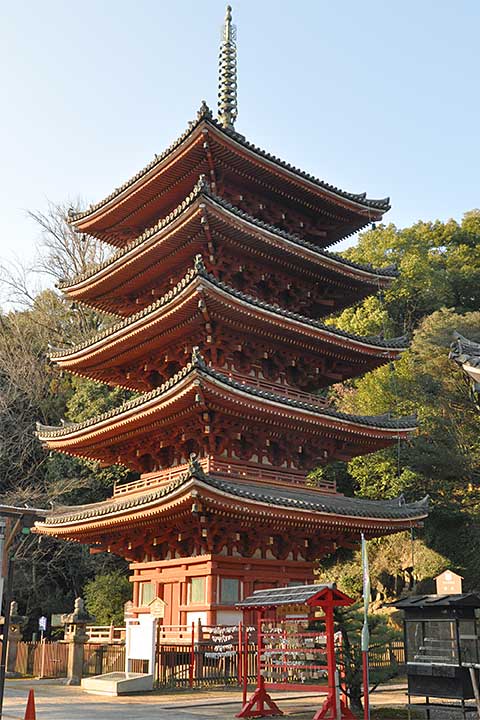 五重塔は室町期(南北朝時代)の建立で、基本的に和様。平面形は正方形で、桁行3間-梁間3間、本瓦葺き(写真#3)。内部は極彩色の壁画があったが江戸時代に取り外され、現在は東京国立博物館の収蔵となっている。現在も壁画はあるが、江戸時代に描き直されたものらしい。尾垂木付きの組物もじっくり鑑賞したい。1962年に解体修理完了。