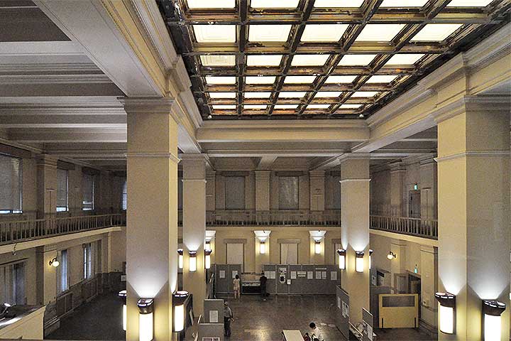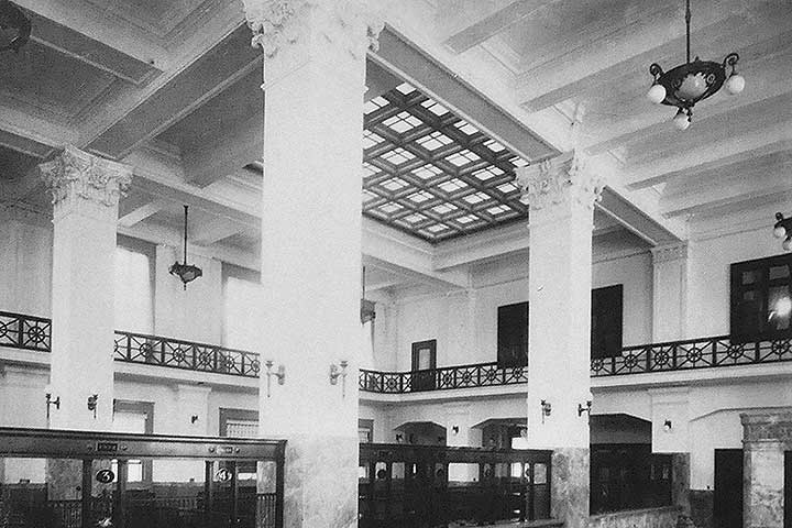続いて内部空間について。平面計画は当時の銀行建築の定番に沿い、エントランスをくぐると吹き抜けの大空間に客溜り・窓口・執務スペースを配し、その奥に支店長室などの個室が並ぶ。吹き抜けの上部を見ると、漆喰によるオリジナルの天井装飾が現存するほか、トップライト(天窓)も確認できる(*1)。当初は内部の柱にも柱頭装飾が施されていたが現存しない。