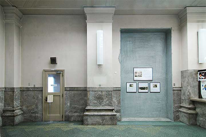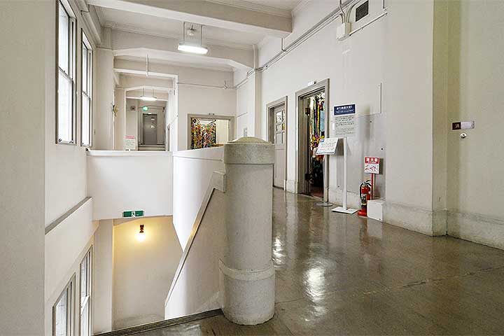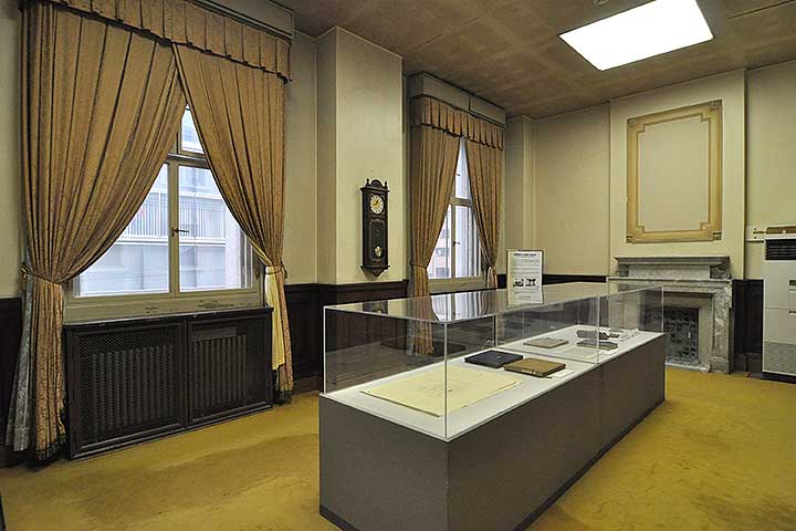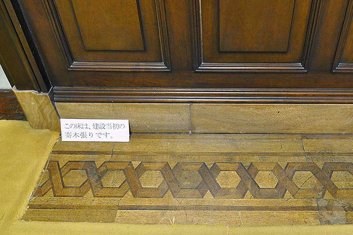 本作の場合、被爆時に1~2階の鎧戸を閉じていたこともあり、支店長室の一部ながら、寄木のフローリングなど被爆前のインテリアが焼けずに現存しているので、ぜひ見学してみてほしい。