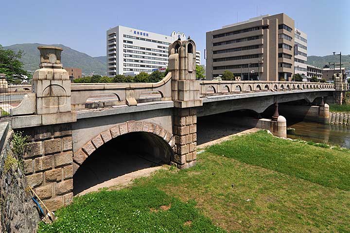 呉駅から両城方面に向かう途中、二河川(にこうがわ)に架けられた橋。川の名前を冠するということは、橋としての序列が高いことを意味する(例えば広島市の京橋や猿猴橋もそう)が、その名に違わぬ名品である。かつては川原石に向かう路面電車がここを走っていた。