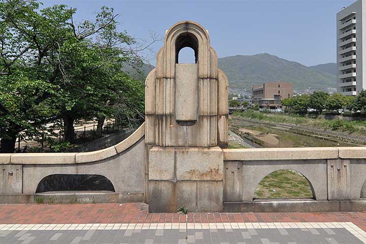 何といっても注目すべきはこの欄干だ。左右対称で規則正しい造形でアールデコ風。建設から80年近く経つが、薄汚れた感じさえも味わいになっている。参考文献1)によると欄干は「花崗石、手摺及間柱鋳物金物(欄間)」とあり、少なくとも金物部分は戦時中の金属供出で失われたようだ。ただ、桁自体もコンクリートなので、欄干がコンクリート&石だけになったことで結果的に素材が統一されており、これはこれで悪くない。これほどレベルの高いものは広島県内にはそう多くないはずで、もっと有名になっていい逸品だ。