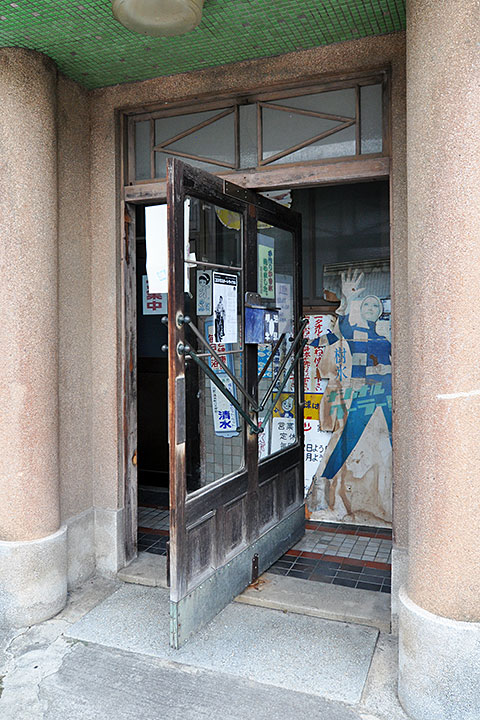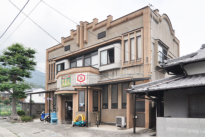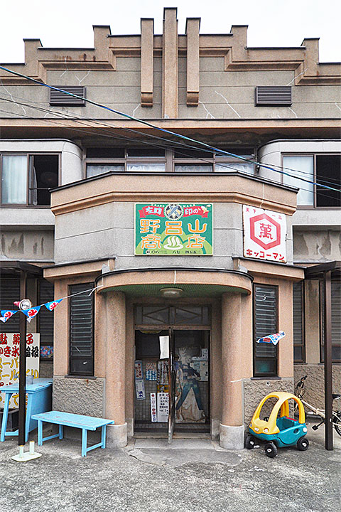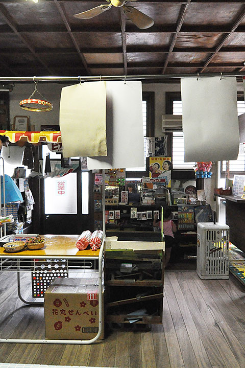 川尻の町のかたすみに建つ店舗。もとは「野呂山温泉」という銭湯だったという。尾道の空家再生と同じ要領で、ゆるーいリノベーションがなされていて、駄菓子屋を中心に子育て世代のサロンのように使われている。