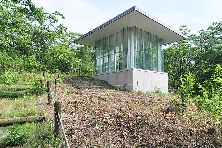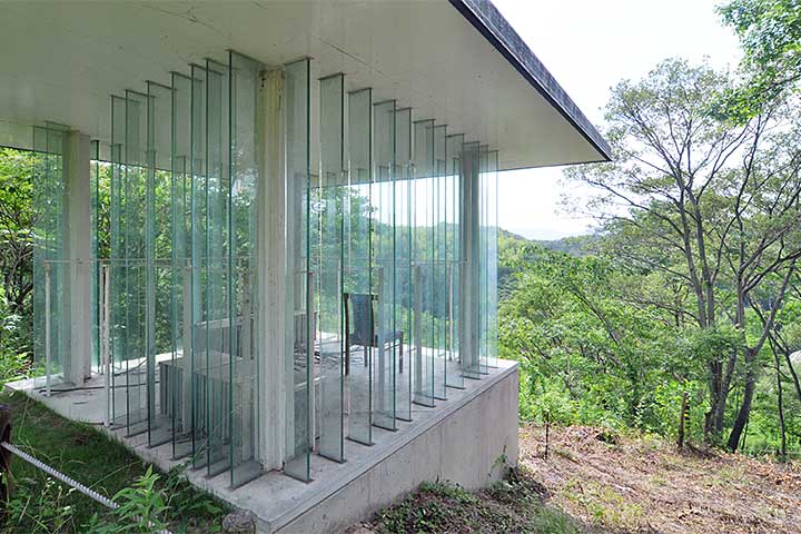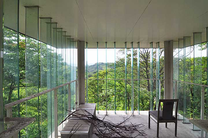 建築としてはモダニズムのプロトタイプに近く、屋根が浮いているような透明感のあるデザインとなっている。だが、透明を維持するにはガラスを清掃しないといけないし、白を白く保つにも日々の管理が必要で、それを洋らんセンターが行うはずもなく(そもそも洋らんセンターの敷地外?)、残念な状況となっている。こうなることは予見できたはずで、この空間を保つために何らか機能を与えるべきだったように思う。例えば茶室にして野点の会場として月一回でも使うようにすれば状況は違っていたはずだ。