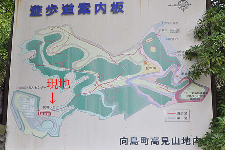 向島洋らんセンター展示棟の裏山にある展望台。この丘陵地は遊歩道が整備されているが、散策しようという人はほぼ皆無らしく、しかも樹木が育ちすぎているので展望台としては機能していない。