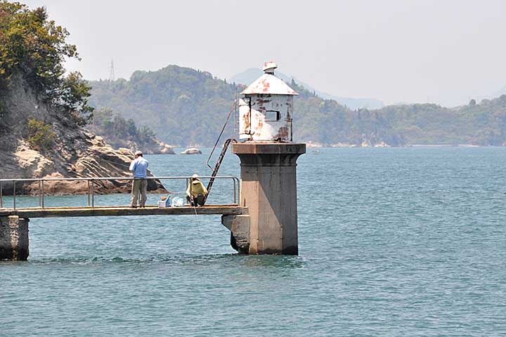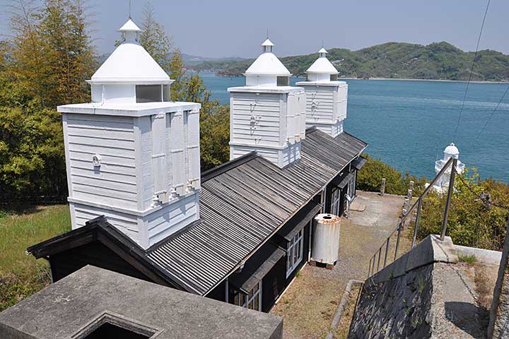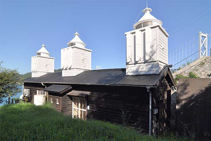 因島(いんのしま)北端、大浜埼に残るかつての信号所。船舶向け信号所は各地に建てられたが、当時の木造建屋がそのまま現存するのは本作が唯一であり、極めて貴重な存在となっている。