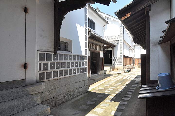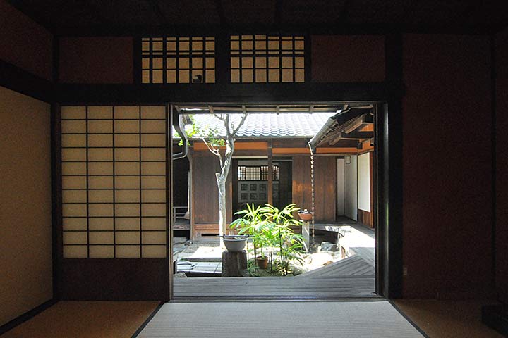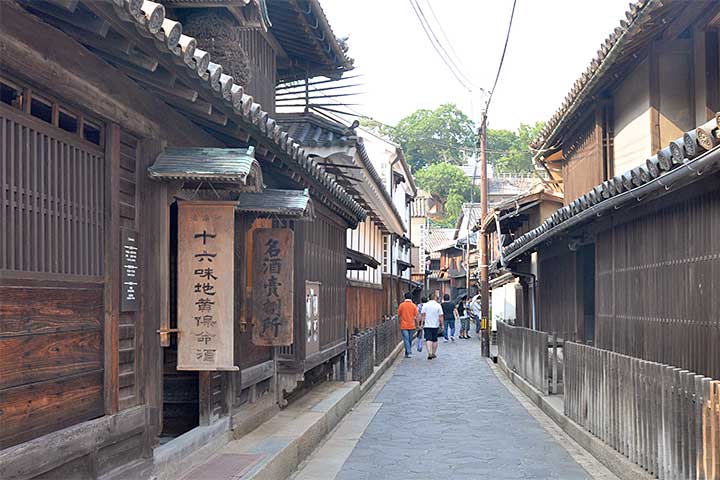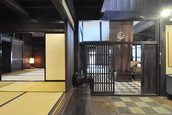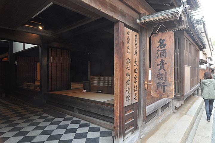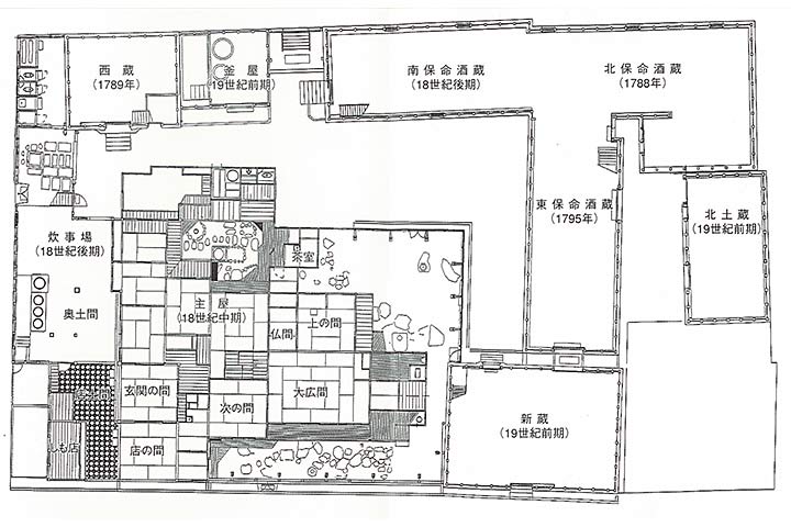 主屋は入母屋本瓦葺(*1)で二階建ての本屋が道路沿いに建ち、座敷棟、使用人棟、茶室などが付属する。18世紀中頃~末に、ほぼ同時期に建てられたようである。道路を挟んで向かい側の海に面する場所には別邸「朝宗亭」が建つ。主屋の裏側には多数の酒蔵が、やはり18世紀後半~19世紀にかけて集中して建てられている。この時期に一気に拡販したのかもしれない。