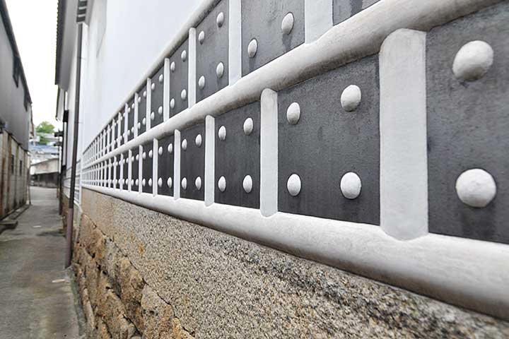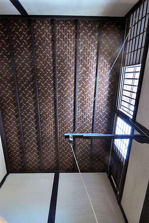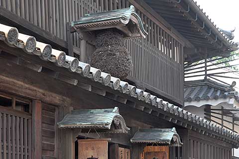 個々の建物も、建築マニアが悶絶する逸品である。主屋は東にみせの間、南に炊事場、奥に座敷、さらに奥に坪庭をはさんで茶室がある。主屋に入ってすぐ目に飛び込んでくるのは土間を飾る瓦と漆喰の市松模様。復元されたものだが一部オリジナルが現存する(写真#7)。見上げると(写真#8)ハイサイドライトにオリジナルの網代天井(あじろてんじょう)。用材や石も素晴らしいが、強く印象に残るのは酒蔵群の漆喰で、なまこ壁の装飾のセンスの良さや施工精度の高さは目を見張るものがある。