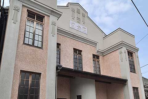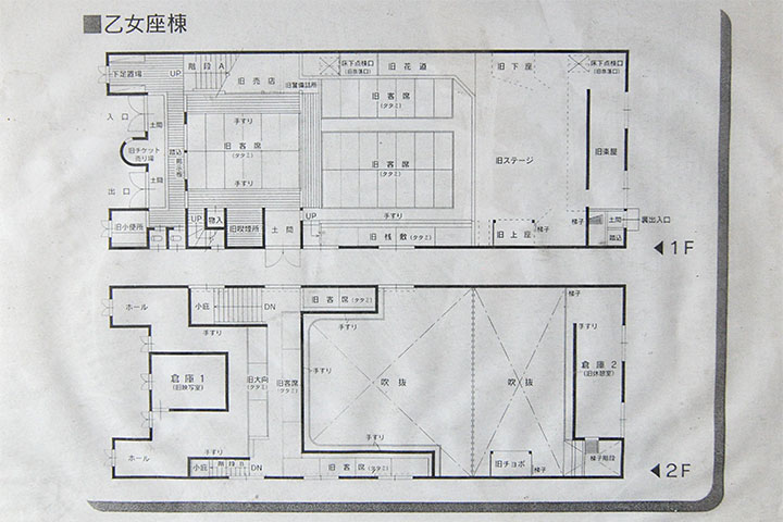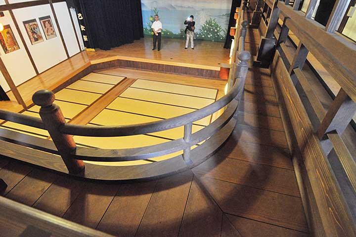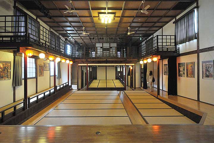 本作の特徴は昭和初期の町場の映画館の趣がよく残されているところにある。ファサードは様式建築の要素を少し拝借して、縦長の窓に列柱っぽい設えやコーニスが付く。室内は、江戸時代以来の伝統的な芝居小屋のスタイルで、天井は格天井。花道や奈落もあるが、かなりの部分は最近の復元のようだ。二階の低い高欄も丁寧な作りであったが、柵が追加されてしまい、より安全にはなったが見栄えを損ねてしまっている。小屋組は当然のようにトラスになっていた。