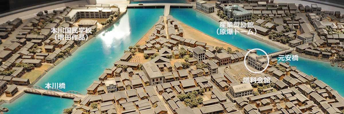 #2:被爆前の姿。当時は燃料会館となっていた(平和記念資料館内の模型を撮影)。本川小学校校舎(ごく一部のみ現存)も増田清による設計。