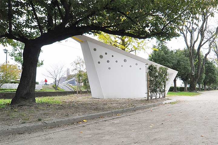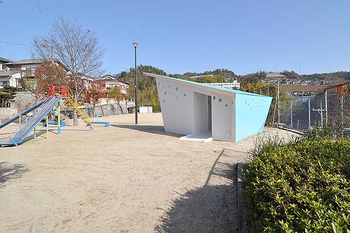 広島市内の公園で公衆トイレを整備するプロジェクト。設計者はコンペで選定され、同形の上屋(*1)が各地の公園に整備されつつある。とりあえず吉島公園と日生西公園の二箇所を見てきたので感想を記しておきたい。なお写真#1-4は吉島公園、写真#5-6は日生西公園である。