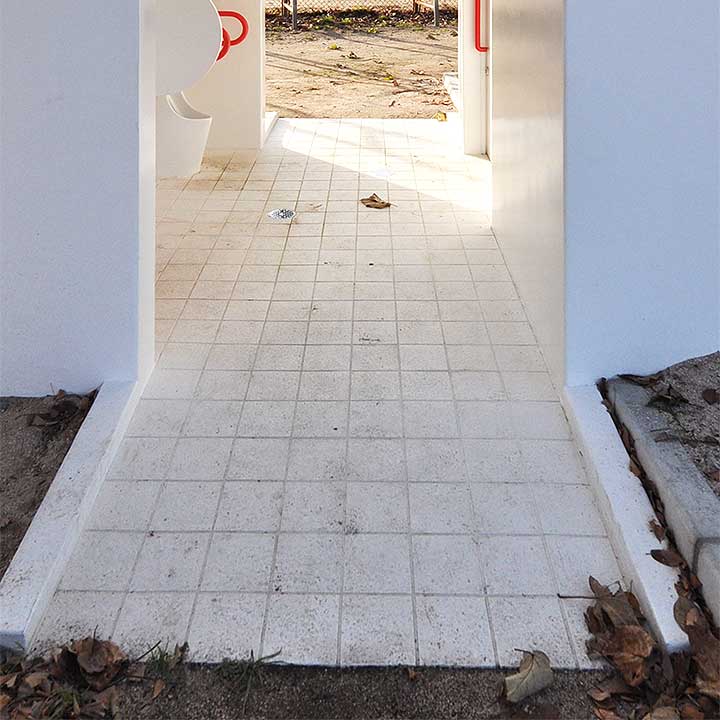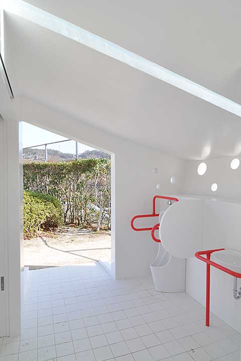 この場合、例えば床の仕上材を土に近い素材(テラコッタ系のタイルでもいいかも)にして目立たなくするとか、むしろ床だけでなく壁の仕上げにも土を使って「大地から三角形のボリュームが生えてくる」ような表現とする方法だってあった。設計者は白イコール清潔感と考えたのかもしれないが、それは白が白く保たれた場合であって、公衆トイレの管理実態をもっと見聞すべきだった。これはファッションビルではないのだから。
