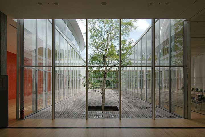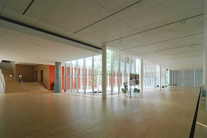 まず外観について。外観上の特徴はやはり曲面で構成された屋根だろう。ホールの天井は丸くないらしいので、この形は機能面から導かれたのではなく、デザインということだと思う。好みの問題だが、やや取って付けたような印象を受ける。ちなみに外構設計はオンサイトが担当している。