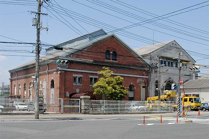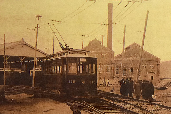 広島電鉄本社敷地内に建つ2棟のレンガ建築(*1)。広島電気軌道が1912年に路面電車を開業する際に火力発電所として2棟同時に建設された。道路から見て左側(南側)の建物は旧ボイラー室、右側(北側)が旧発電機室であり、設備を収容するため2棟とも半地下の床を持っていた。かつては2棟の目前に平田屋川という運河があり、燃料の石炭を船で搬入していたという。昔の写真を見ると2棟の間に大きな煙突が立っていたようだ。その後、1934年には発電所としての機能が廃止され変電所となった。