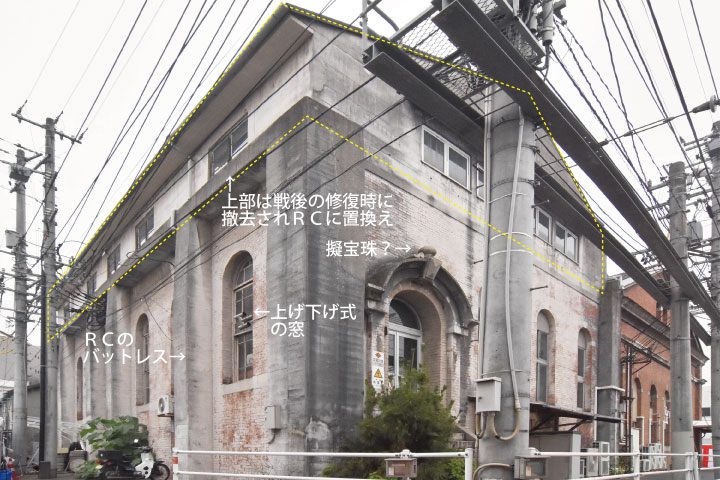 被爆時には室内を焼失するも辛うじて倒壊は免れた。応急措置を受けて再稼働し、1958年に補修工事を受けたうえで現在も変電所・事務所として使われている(左が事務所、右が変電所)。1958年の工事について文献2)をベースに詳述すると、変電所棟はレンガ壁自体も損傷していたため、上部のレンガを撤去してRC壁に置き換え、存置したレンガ壁を補強するため外側にRCのバットレスが追加され、壁は白く塗られた。そのため変電所棟では当初あったはずのコーニスやペディメントは失われている。なお、小屋組の鉄トラスは被爆時に損傷しており、旧材を再利用しながら再構築された。一方、事務所棟は内部に床を作ることで平屋だったものが2層構造に変更されている。