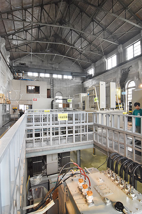 変電所棟は今なお設備が収められているため、当初からの半地下が保たれており、平屋なので小屋組の鉄トラスもよく見える。エントランスは大きなアーチとなっており、擬宝珠が付くなど装飾性が高い。また、足元を彩る石材も印象的で、趣のあるしつらえである。内部空間は比較的往時の姿を留めているように思われる。