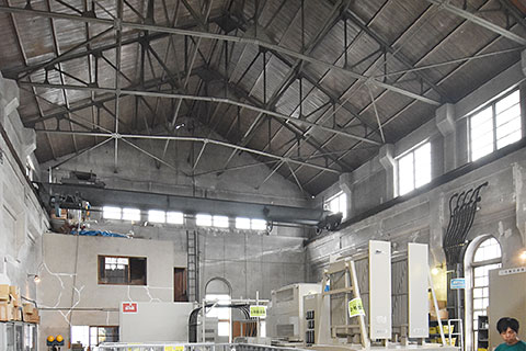 #1:左側(南側)は事務所棟(旧ボイラー室)、右側(北側)は変電所棟(旧発電機室)