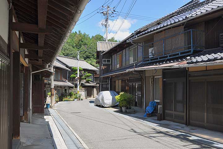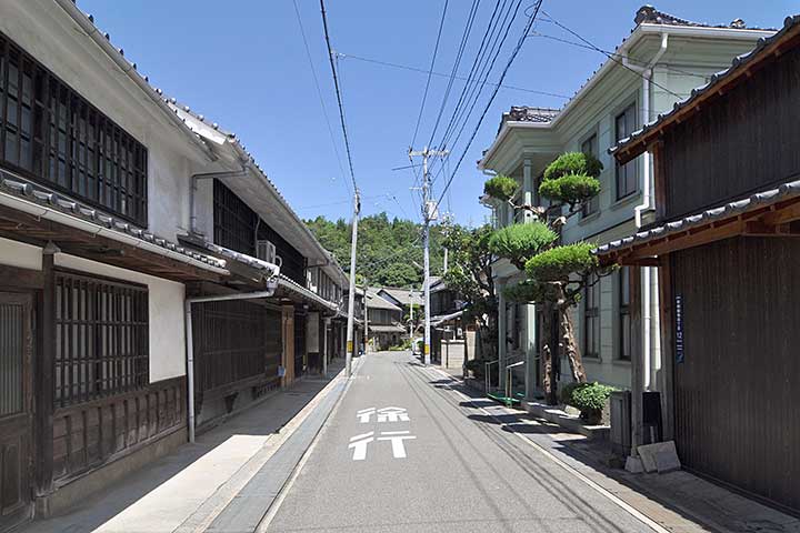 #1 三原近郊の海岸線に沿って細長く形成された旧市街地。漁港として、また地乗り航路の寄港地として栄えたという。町家がまとまって残るのは南山資料館周辺。建設年代が近いのかローカルルールがあったのか、軒のラインが揃っている。二階の階高が低めに設計されているので、中には江戸時代のものもあるかもしれない。一方、海側は埋め立てられ、かつての港湾は完全に失われてしまった。