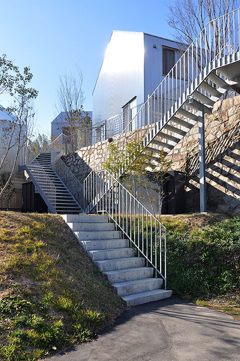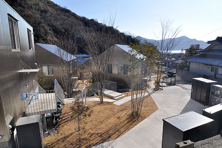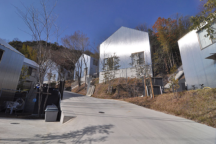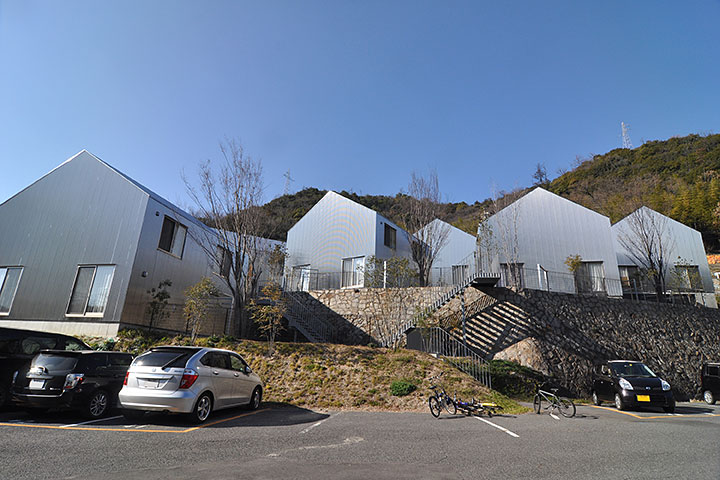 写真からも分かるように、まるでCGの合成のようなシーンがリアルなものとして目の前に現れたのには驚かされた。つまり、本作のポイントは家のフォルムの抽象化、すなわち「イエ」と聞いて誰もが思い浮かべる五角形(切妻)の単純なかたちを使って瀬戸内海地域のどこにでもある集落を解釈・再構成した点にある。各住棟のボリュームは周辺の家々と何とか調和する程度に抑えられ、それらが少しずつ向きを変え、前後し、スキマ空間を生み出しながら、伝統集落のような群建築を形成している。木造だが外装にはステンレスが使われ、空の色を写し込むことで刻々とその色を変えていく。さらに敷地内には新たに100本の樹木が植えられたという。この種の先例である坂本一成の「コモンシティ星田」でも個々の建物はここまで抽象化されてはいない。社宅であったために、より思い切った表現にチャレンジできたのだろう。