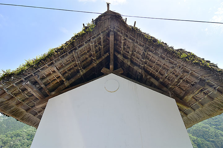 外壁は漆喰で仕上げられ、四面とも傾斜している。屋根は茅葺の置き屋根で、神社のような千木が付いている。