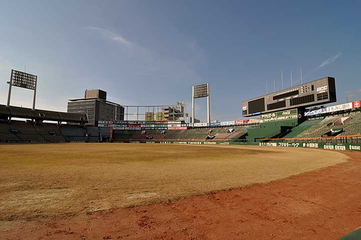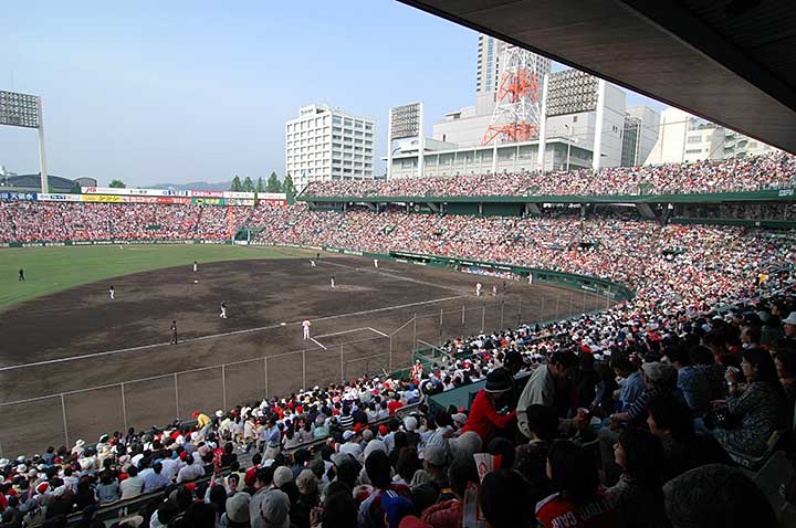 広島東洋カープ(*1)は創設以来本拠地を市街地の南端にある広島総合球場(現広島県総合グラウンド)に置いていたが、交通の便が悪くナイター設備も無いことから都心へ移転させることになり、財界からの寄付等によりこの位置に建設された。第1期工事は着工からわずか5ヶ月で竣工という突貫作業だった。その後、この球場でカープは1970年~80年代に黄金期を迎えることになる。