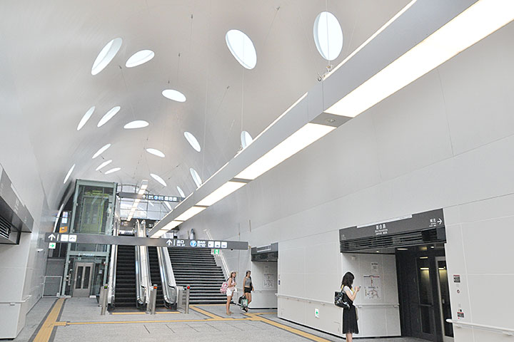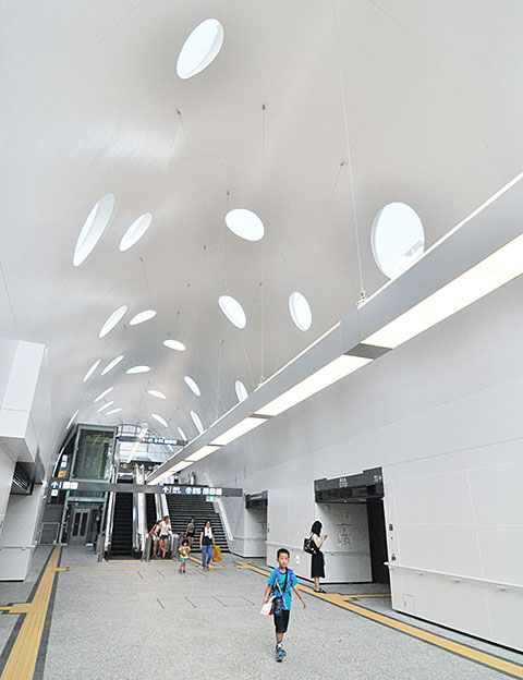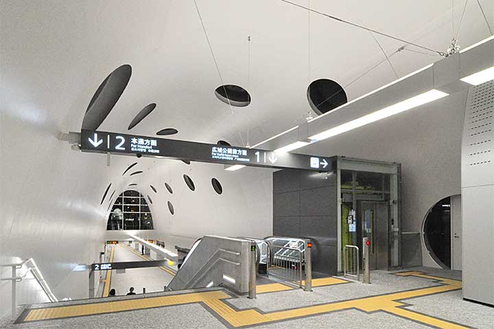 まず駅の立地を見てみよう。アストラムラインは、丘陵地を切り開いて開発された広島の北部住宅市街地と都心を結ぶ新交通システムであり、都心部は地下路線で途中から高架になるが、本作はまさに地下から地上に上がってくる地点、浅い地下にある。上下線の既設ボックスカルバートの間に駅コンコースが新設され、カルバートの側壁に穴をあけて乗り降りできるようにしている。このような構成は設計者選定前に決められていた。