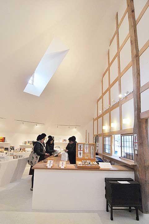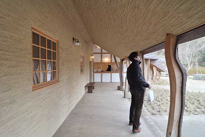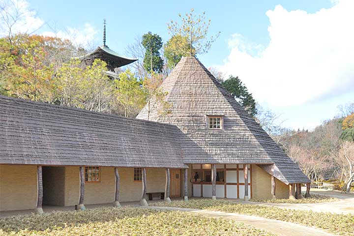 敷地の入口にある総門(写真#1)は1967年に京都から移築したもので、もとは京都御所内にあったという。門をくぐるとまず目に付くのが藤森照信による寺務所だ(写真#2-4)。岩山の松の古木をイメージしたといい、手曲げ銅板(ワークショップで手作りしたもの)で葺いた屋根の上に松が植えられている。