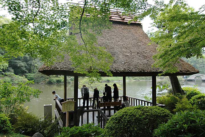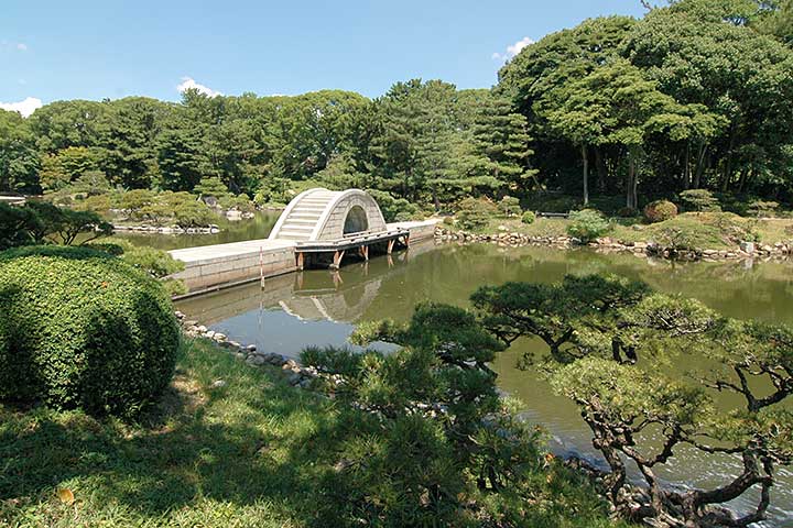 江戸時代の広島藩主浅野長晟(あさのながあきら)が1620年から築造した庭園。桃山~江戸期の武将にして茶人の上田宗箇(うえだそうこ)が作庭を担当した。その後、1940年に浅野家から広島県に寄付され、同年国名勝に指定された。園内のほぼ全ての樹木や木造建築は、戦災により失われて戦後復元されたものだ。