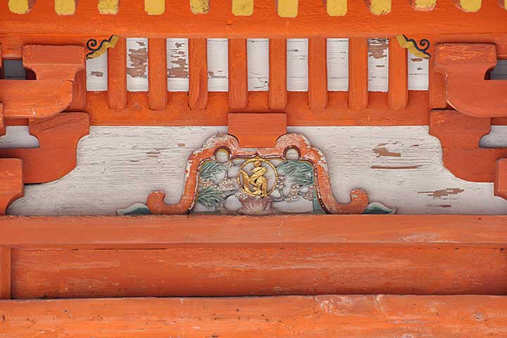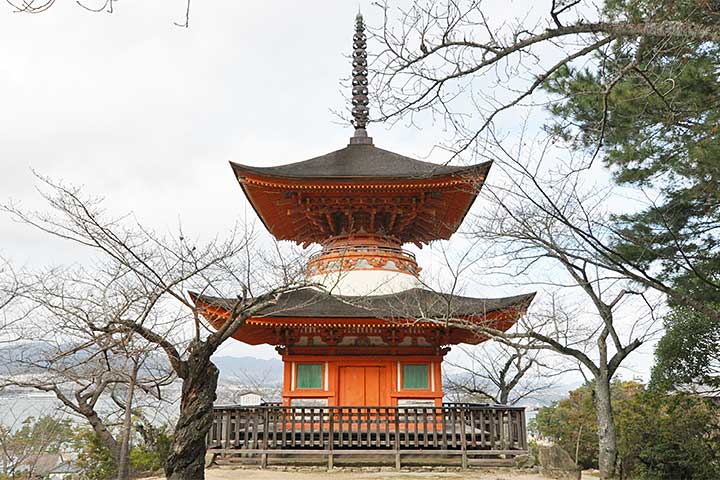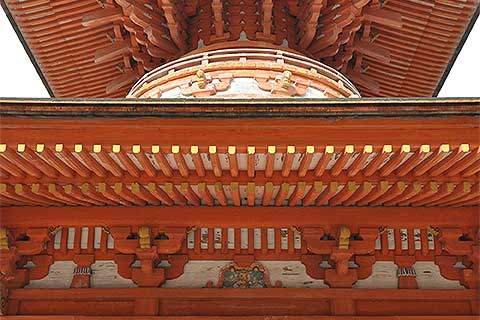 厳島神社宝物館のすぐ脇の坂道を上がると見えてくるのがこの多宝塔。1階の平面は方形、2階は円形で、屋根はいずれも方形。そのため2階の組み物はにぎやかなことになっている(写真#2)。ディテールの見どころの一つが蟇股(かえるまた)で、厳島神社のそれとは違って装飾性が増しており、梵字が彫り込まれている(写真#3)。 また、小高い丘にあるので、厳島神社を眺めるビュースポットともなっている(写真#4)。