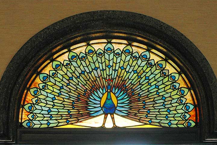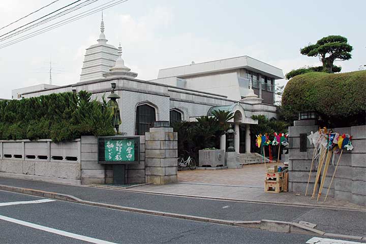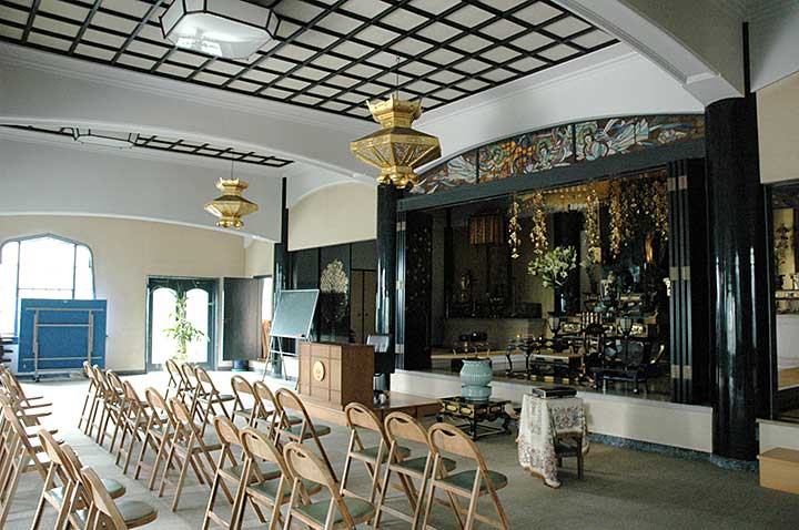 第一印象としてインド風のデザインが目を引くが、おそらく築地本願寺の影響だろう。築地本願寺の意匠をマネしているというよりは、「お寺をインド風に作る」という発想の影響を受けていると言うべきだろう。よく見ると花頭窓やらエンタシスの柱やらがあって混乱しそうだが、デザイン的に破綻しているわけではなく、それなりにまとまった佇まいを見せている。いわゆる和風の意匠よりもこちらの方がRC造と相性がいいからだと思う。