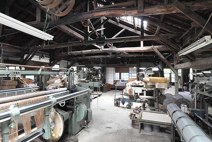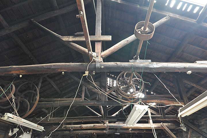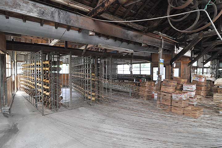 江田島の市役所がある中町エリアにある紡績工場。紙の糸で布を織り上げる技術を持つ希少なメーカーとして知られる。建物は大正期~昭和戦前期のように見受けられる。小屋組は木トラスで、動力を伝えるためのシャフトや車がそのまま残されているのも貴重だ。