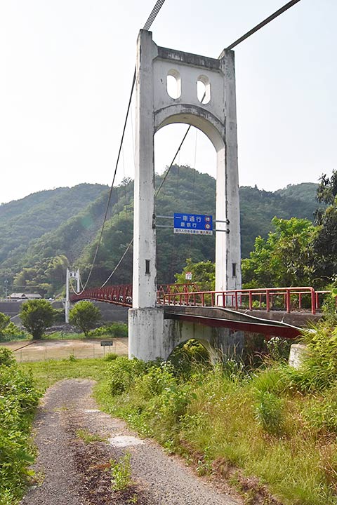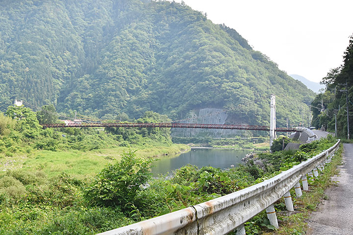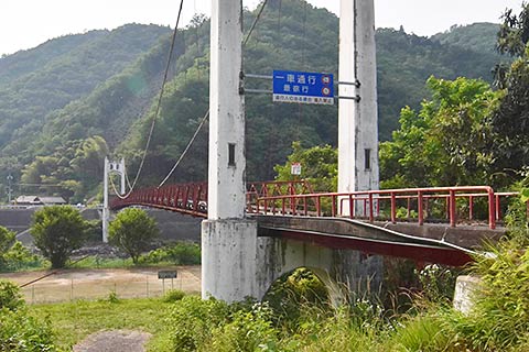 山間部を流れる太田川にかかる橋梁。広域な市域を持つ広島市の中でも奥地と言える地域だ。建設年代は未調査だがかなりの年代物で、交通需要が少ないので最低限の吊り橋のまま残されたのだろう。鉄骨の桁に木の板が渡されているだけのシンプルなものだが軽自動車は通行できる(重量制限あり)。周辺には廃止された可部線の鉄道橋も残されている(写真#4)。