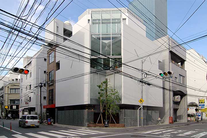 広島の中心市街地に建つ商業建築。沿道部分は壁で閉じられ、角にスリット状の開口部を配している。美容室という用途も考えて、あえて閉鎖的な空間としてインテリアデザインで勝負するということのようだ。