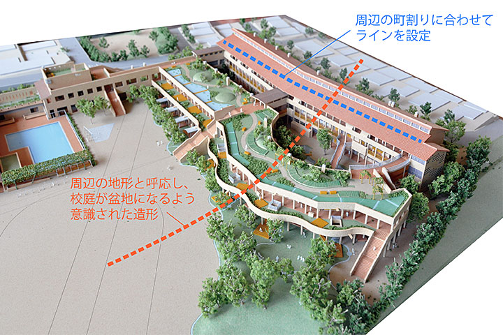 普通教室・特別教室が入る校舎は二つのボリュームに分けられて東西方向に平行配置され、間には中庭が設けられている。北側の棟はほぼ板状だが、周辺の町割りにあわせて途中で「く」の字に折れ曲がっている。南側の棟はセットバック型で南にいくほど張り出す形になっており、棚田のように見えるが、周辺に広がる丘陵部の住宅団地の地形を表現したものだろう。校庭を盆地のように見立てて周辺と違和感なくなじむように工夫されている。