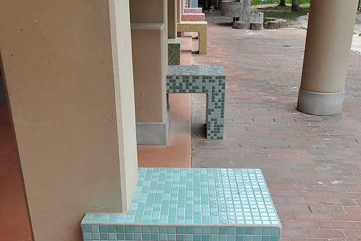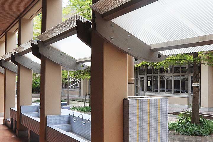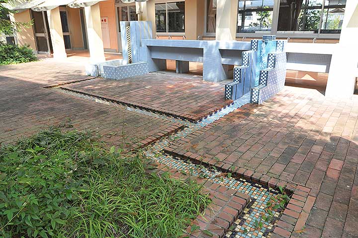 校内の各所に遊び心満載の仕掛けが用意されている。例えば「理科の庭」と呼ばれる中庭には排水用の溝が掘られており、雨水や手洗いの排水が流れていく様子が目に見える。作家性が強いデザインだが、独りよがりというわけではなく、子供に近い目線でのデザインが心がけられているのが分かるし、ディテールにいくほどその方針は徹底されている。また、タイルや煉瓦など、材の選択の巧みさはここにも現れている。