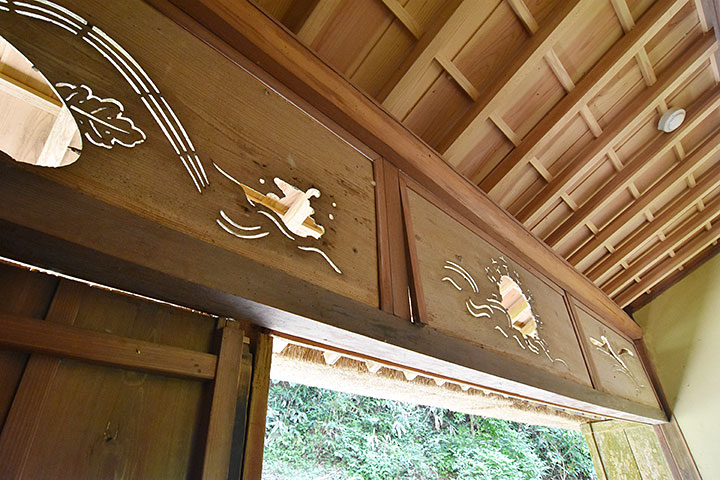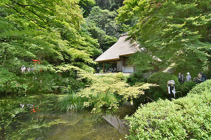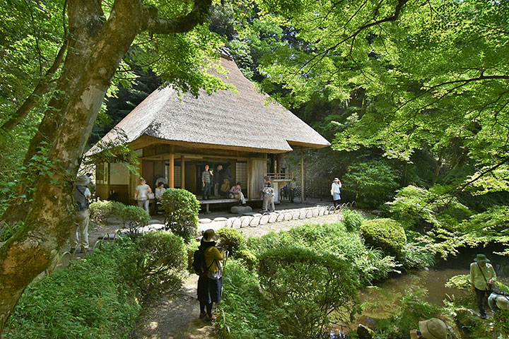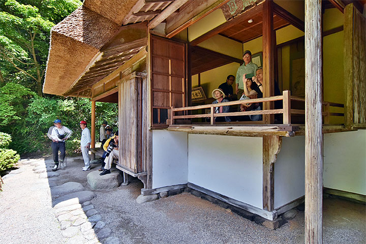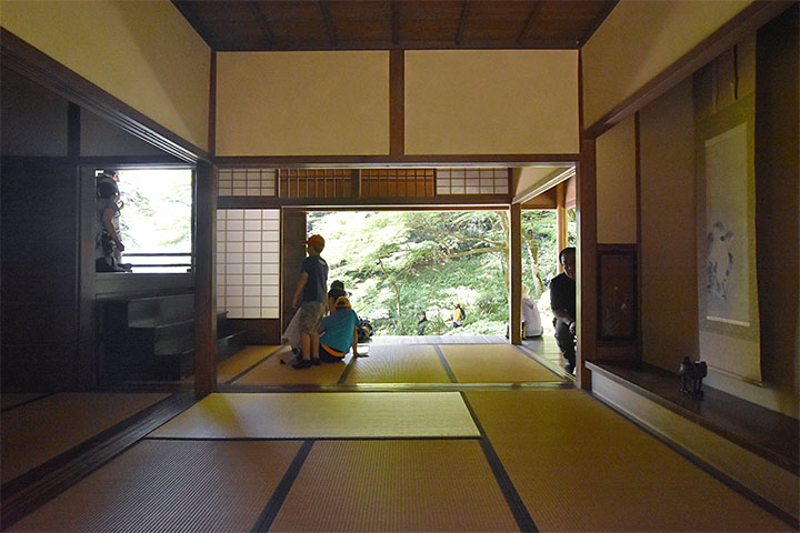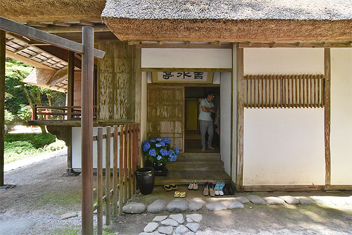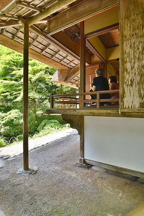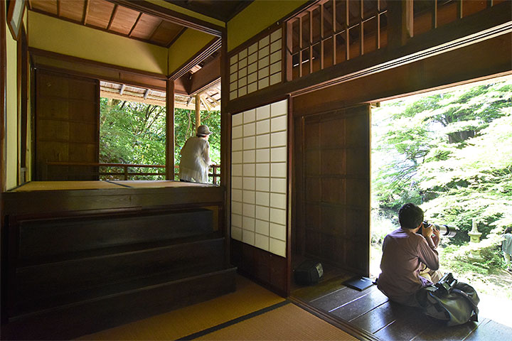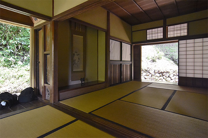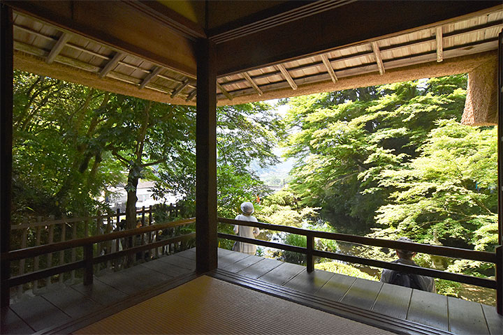 吉水亭は回遊式庭園である吉水園の奥、高くなった場所に建てられており、加計の町や背後の山々を借景に吉水園を鑑賞する視点場として計画されている。特徴は、四畳間・六畳間の座敷に加えて、二畳の高間(中二階)が設けられているところだ。木々が育っているので当初の意図とは違うかもしれないが、座敷にレベル差を付けることで眺望を変えており、高間からはより遠方を見通すことができる。細部の意匠において極端に奇をてらったものはないものの、この自由なデザインは数寄屋と呼んでよいだろう。