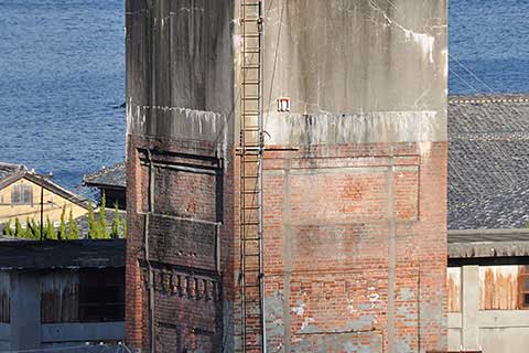 能美島の海沿いに建つ工場施設群。当初は朝日紡績能美島工場として1896年に建設されたもので、その後所有者も変わり、増築を重ねていったようだ。2013年まではユウホウ能美工場であったが、2014年1月現在では操業停止となっている。